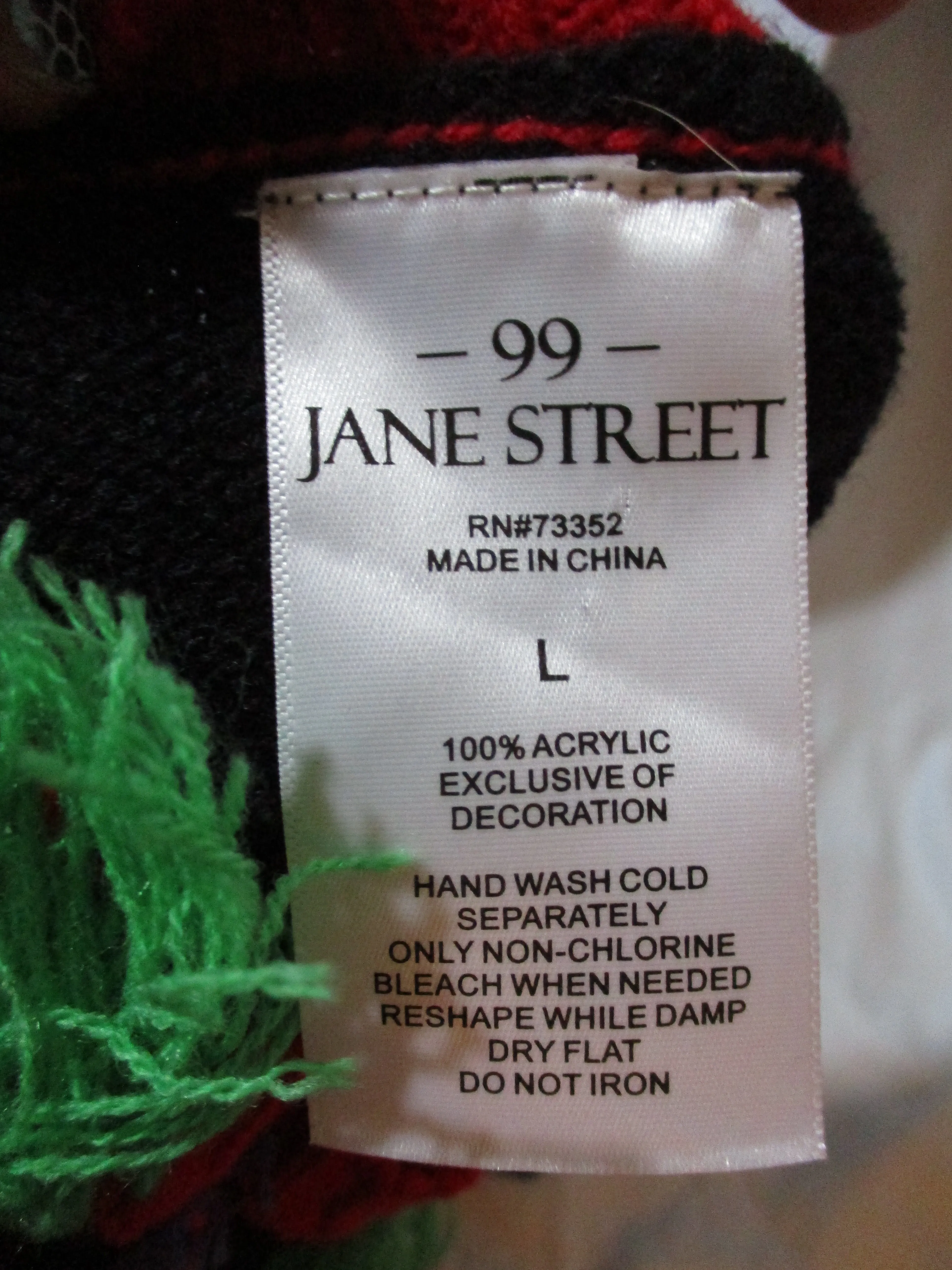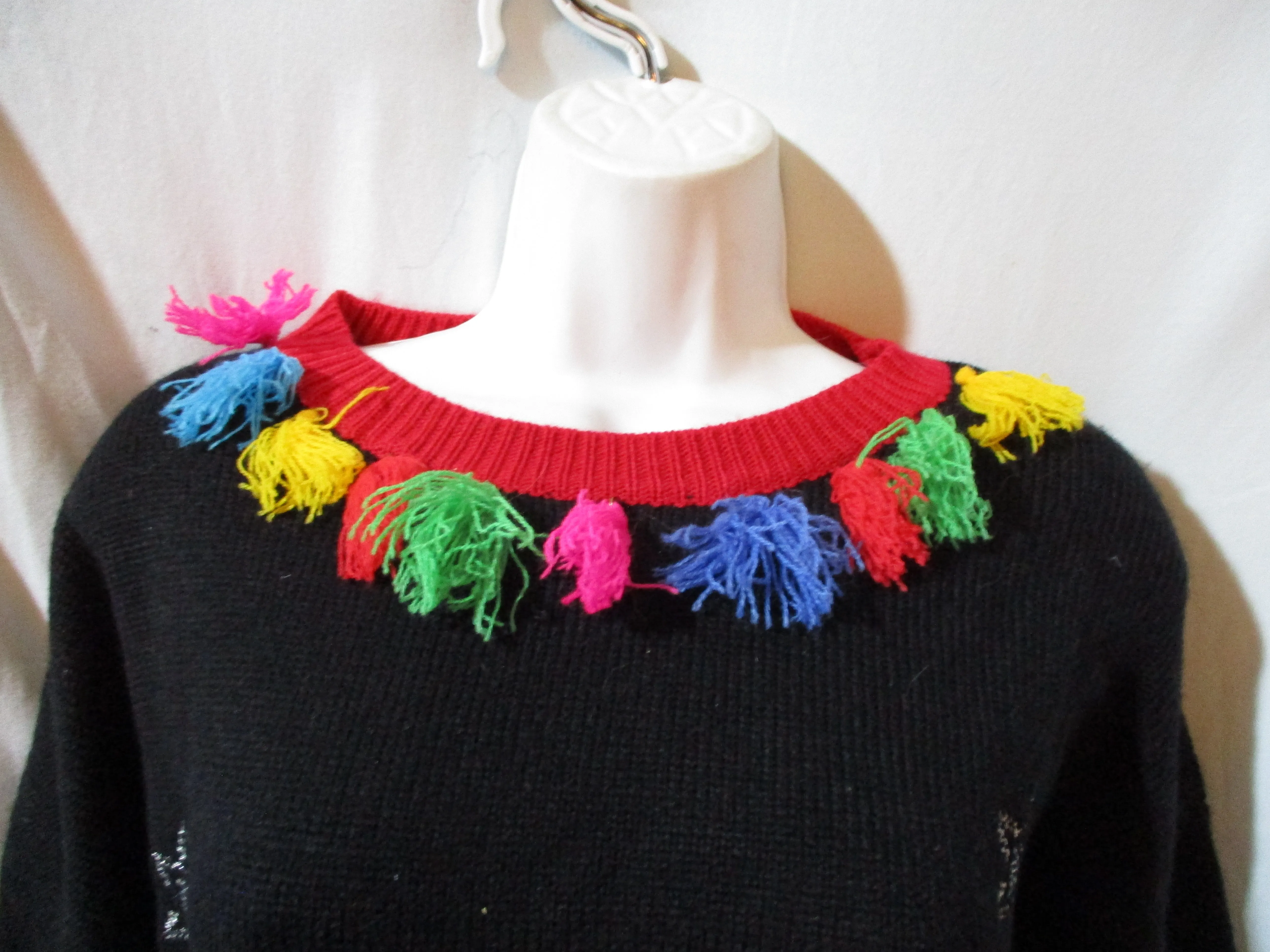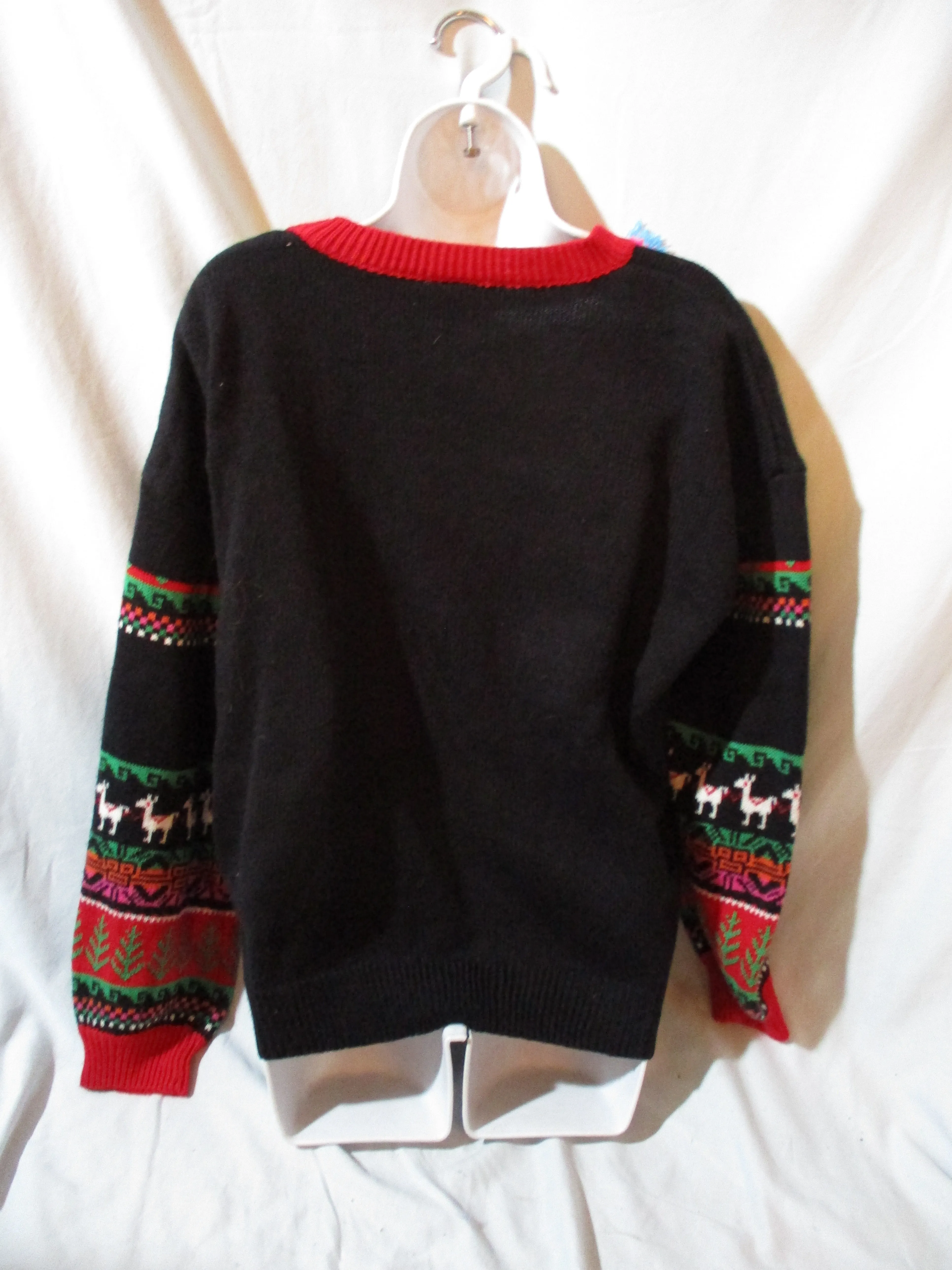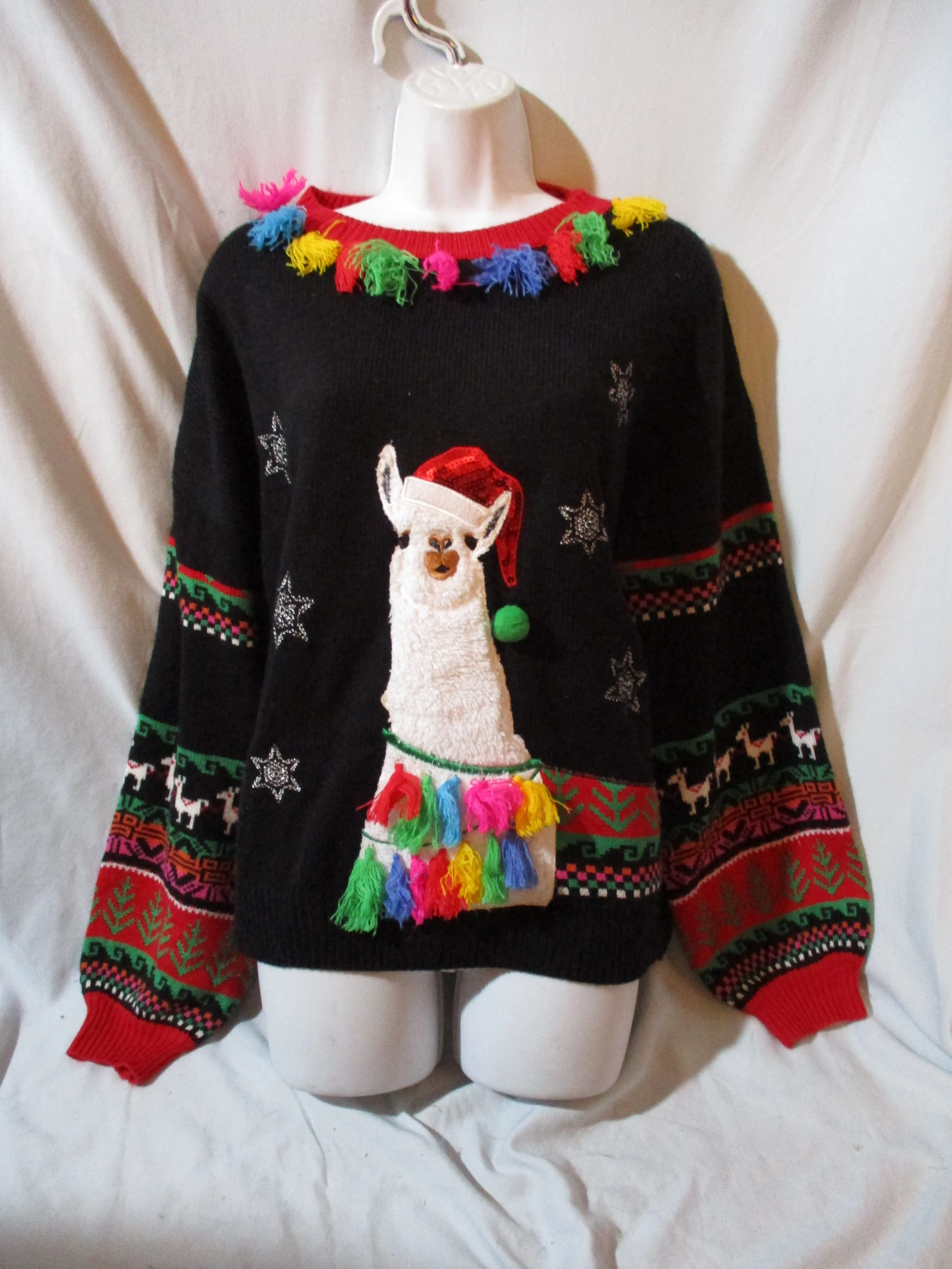 Gift quality 99 JANE STREET LLAMA FRINGE TASSEL ugly holiday sweater / pullover / jacket / sweatshirt, size large with black multi-color design, sequins, super colorful and festive. Measures approx 21" arms, 25.5" shoulders, 50" chest, 25" long. Perfect for movie fan or holiday party!