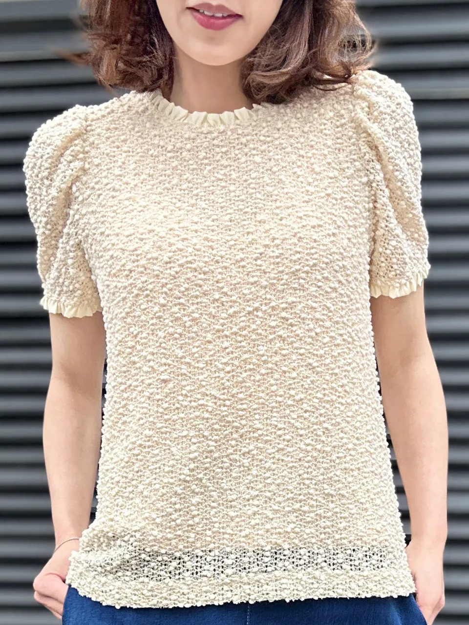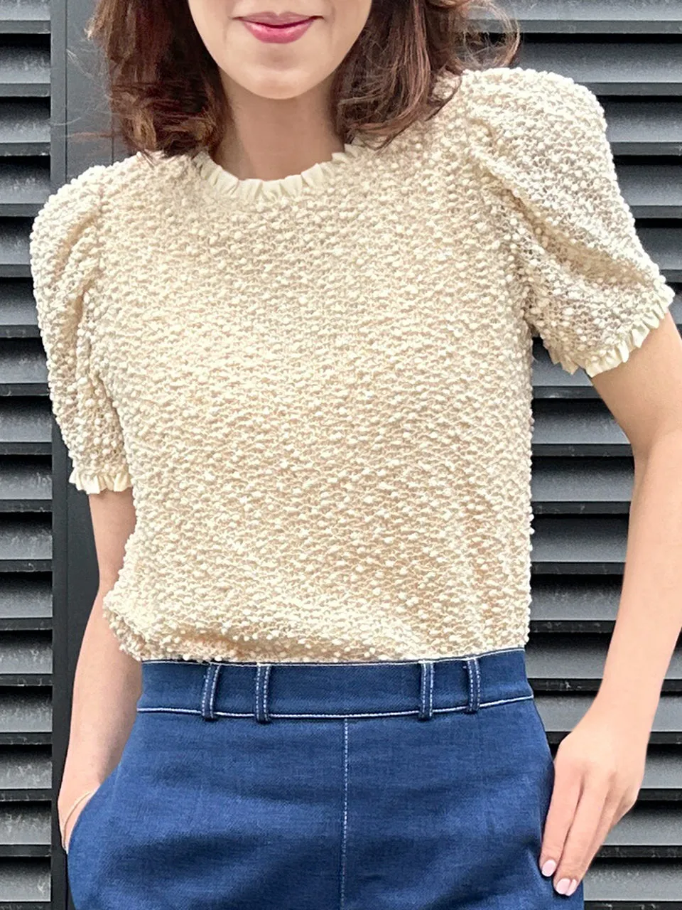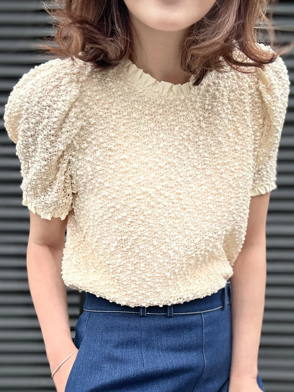 Made of our gorgeous signature guipure, here you go is a very feminine top with a delicate ruffled crew neck and matching sleeve hem for you to feel glamorous and confident. Slightly romantic with a touch of fancy thanks to its slightly pleated shoulders to create a puffy sleeves, This is the ideal top to elevate your everyday wardrobe. Available in two different fabrics: white knit and custard lurex guipure.